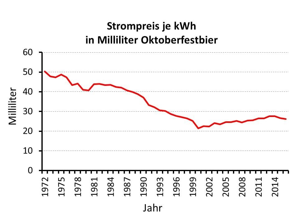 Wie man sieht ist Strom, gemessen in der härtesten Währung des Münchner Oktobers, in den Jahren 1972 bis 2000 kontinuierlich billiger geworden. Seit 2000 steigt der „Bierstrompreis“ wieder leicht an, erreicht aber noch lange nicht die Höhen der 1970er Jahre und ist über die jüngste Vergangenheit auch wieder leicht gefallen – die Kilowattstunde notiert zurzeit bei 26 Milliliter Bier.
