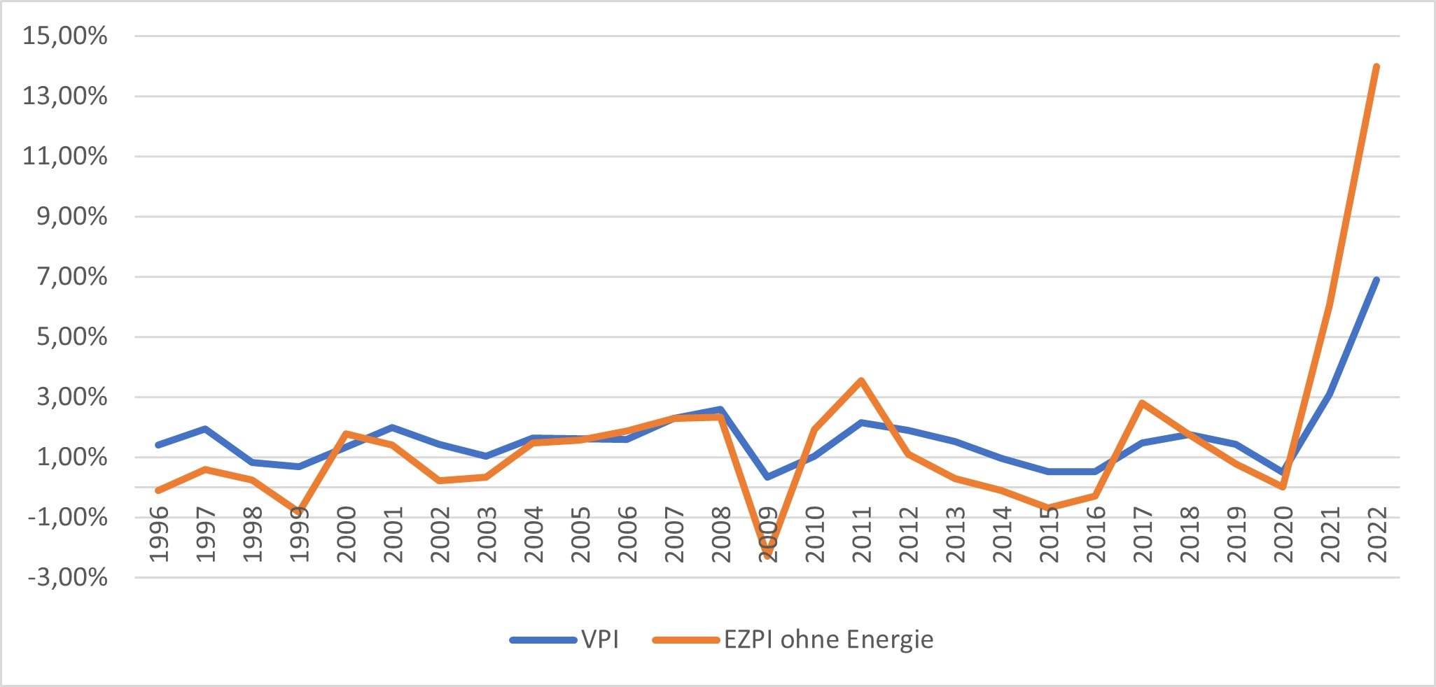 Aber natürlich: Bei dem VPI handelt es sich um einen Index für Endkundenpreise, technisch „Outputpreise“, den Netzbetreiber treffen aber „Inputpreise“, die beispielsweise durch den Erzeugerpreisindex für gewerbliche Produkte dargestellt werden können. Diese beiden Indexreihen korrelieren aber stark (auch wenn Herr Lohse das nicht ganz wahrhaben wollte, so viel Unterschied macht es nun nicht, ob man als Privatperson oder als Unternehmen Lebensmittel einkauft). Wie die Gegenüberstellung von Inflationsrate und dem Verlauf der Erzeugerpreise in der Graphik zeigt, verlaufen die jährlichen prozentualen Preisänderungen annähernd parallel. Auch die Preisexplosionen der vergangenen beiden Jahre betreffen nicht nur die Verbraucherpreise, sondern natürlich auch die gewerblichen Produkte und Vorleistungen.