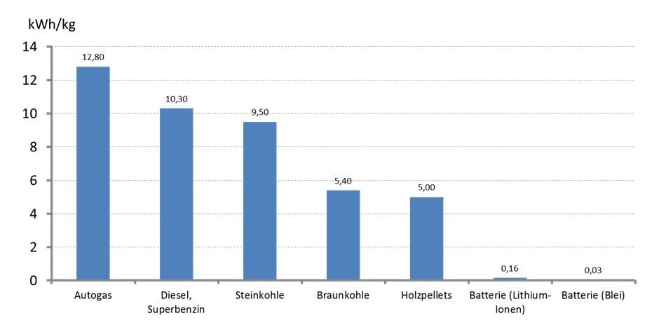 Diesel wie Benzin bieten neben einer vergleichsweise guten Handhabbarkeit eine hohe Energiedichte und sind so zum Mittransport geeignet. Erkennbar ist der deutliche Abstand, den Batterien zu anderen Energieträgern haben. Erkennbar ist auch die noch kommende große Herausforderung der Energiewende: Abgesehen von Pumpspeicherkraftwerken, deren Speichervolumen mit Blick auf das Gesamtsystem nachrangig ist, ist die einzige bekannte großtechnische Bevorratung von Strom eine Kohlehalde neben einem Kohlekraftwerk. So gesehen geht es nicht nur um die Dekarbonisierung der Stromproduktion, sondern um die Dekarbonisierung der Strombevorratung.