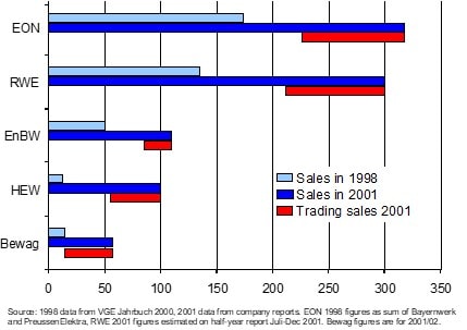 The figures are remarkable. Eon, taking the combined supply volume of its predecessors, has grown from supplying roughly 175TWh to around 330TWh. RWE has gone from 135TWh to around 300TWh; EnBW from 49TWh to 110TWh. Small German electricity companies have also recorded high growth: HEW, part of Vattenfall Europe, sold about 14TWh in 1998. It now supplies 100.9TWh. MVV, the municipal supplier for the town of Mannheim, has grown from 1.5TWh to 14TWh.
