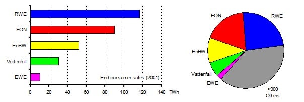 One reason so many people accept headline sales figures even though they include trading is that the real figures arc hard to come by. Since liberalisation in 1998, VDEW has not published end-customer sales figures. The electricity suppliers judged this information confidential and stopped giving the necessary data to VDEW. Most company reports provide a basic structure of the sales portfolio, but do not give a breakdown into national markets. So one has to dig deeply into published data to come up with figures for end-customer sales, and this facilitates only estimates. The pie chart provides an estimate of market shares in the German market.