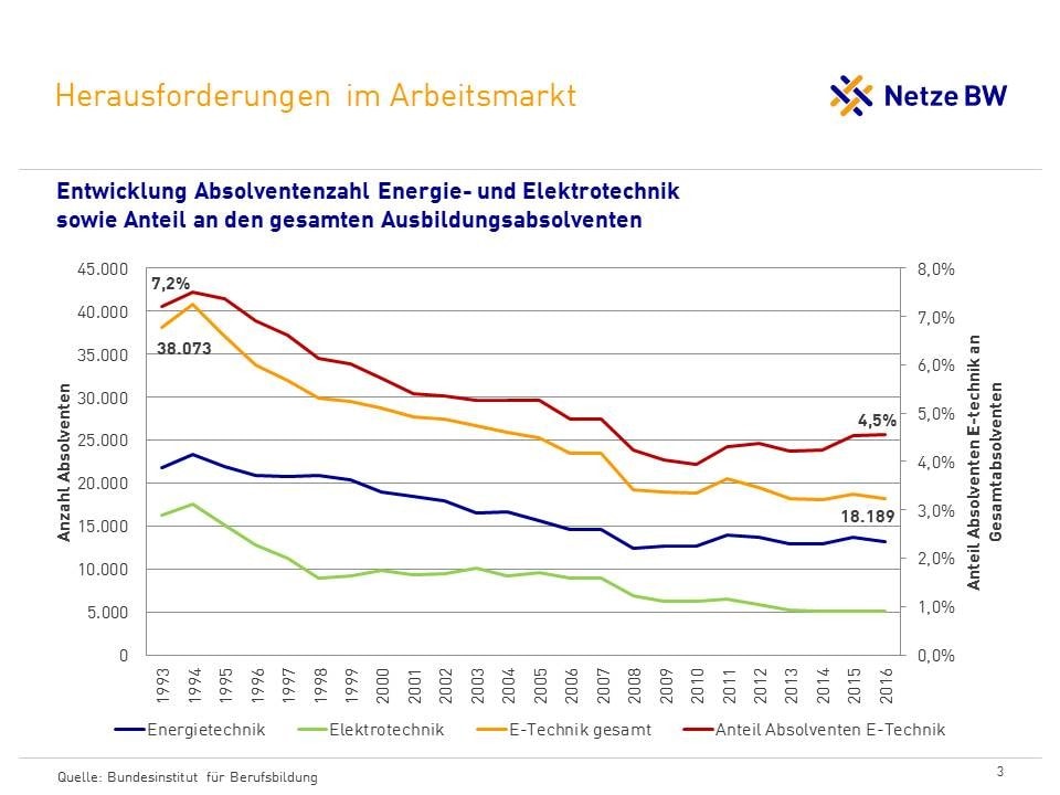 Dienstag fand in Düsseldorf die große ver.di-Stadtwerke-Tagung statt. Thema waren die Herausforderungen, die sich für Stadtwerke in den nächsten Jahren stellen. Auch wenn ich eher bei einem „Landwerk“ als bei einem Stadtwerk arbeite, war ich eingeladen, mit einem Vortrag an der Diskussion teilzunehmen. Meine Kernthese dabei: Eine, wenn nicht die zentrale Herausforderung für Stadtwerke, Regionalversorger und Großunternehmen gleichermaßen liegt im Arbeitsmarkt. Unter halbwegs guten wirtschaftlichen Rahmenbedingungen werden wir im Zweifel immer das Geld finden, um die Energiewende zu finanzieren. Uns werden aber möglicherweise die Köpfe (und Hände) fehlen. Die Zahlen sprechen da eine deutliche Sprache: In den letzten Jahren kennt die Entwicklung der Abschlüsse für Energietechniker und Elektrotechniker nur eine Richtung – nach unten (siehe Grafik).