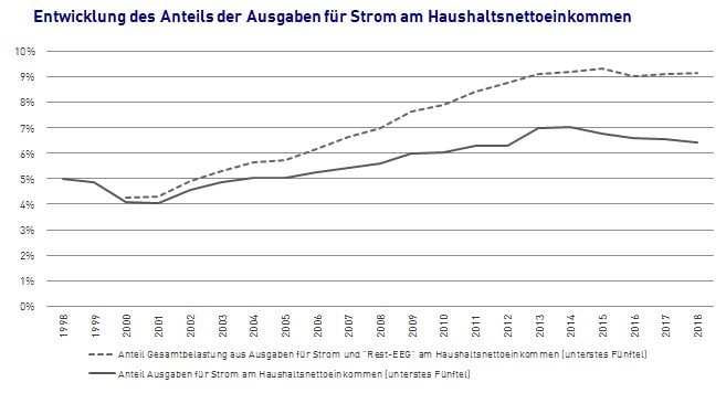 Das ist schon recht erklecklich, heißt es doch, dass diese Haushalte über drei Wochen im Jahr nur für die Stromrechnung arbeiten (und dann ist die Wohnung noch nicht beheizt). Allerdings ist die tatsächliche Belastung aus der Energiewende noch höher. In der Stromrechnung der dicken grauen Linie ist nur der Teil der EEG-Umlage enthalten, die die Haushalte 2018 direkt über die Stromrechnung bezahlt haben, also in 2018 grob 220 € (bei 3.300 kWh Jahresverbrauch des Durchschnittshaushalts und 6,79 ct/kWh EEG-Umlage). Nicht in dieser EEG-Belastung enthalten ist derjenige Teil der EEG-Umlage, den der Haushalt über alle Konsumgüter und Dienstleistungen, die mit Strom produziert werden bzw. für die Strom benötigt wird, indirekt bezahlt hat – getrost unterstellt, dass die EEG-Umlage von allen produzierenden/dienstleistenden Betrieben weitergereicht wird. Die tatsächliche Belastung aus dem EEG ist also entsprechend höher und mit einer einfachen Gegenrechnung leicht bestimmbar: Grob 24 Mrd. € Subventionsvolumen des EEG 2018 verteilt auf 40 Mio. Haushalte ergibt ca. 600 € pro Haushalt. 220 € sieht der Haushalt direkt auf seiner Stromrechnung, weitere 380 € treffen ihn „unsichtbar“ über die Friseurrechnung, die Brötchenpreise beim Bäcker etc.; generell also über alle Dinge und Dienstleistungen, die er konsumiert. So gesehen liegt der Anteil der Stromkosten am Haushaltseinkommen des unteren Fünftels nicht bei 6,5 %, sondern bei über 9 %. Dass der Staat auf die 380 Euro auch noch Umsatzsteuer nimmt, ist dabei noch gar nicht berücksichtigt.