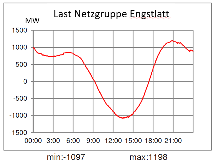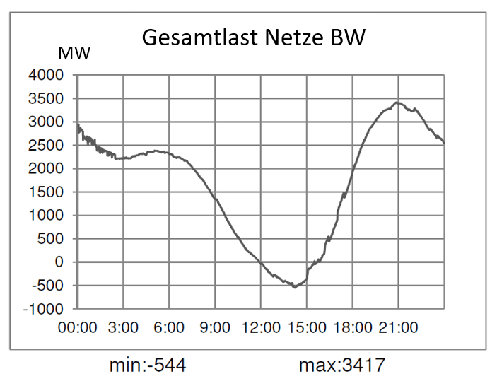 Der „Lauf der Sonne“ ist in der Lastkurve gut (quasi „gespiegelt“) zu erkennen. Negative Werte bedeuten, dass die Netze BW keinen Strom mehr vom vorgelagerten Übertragungsnetz bezieht, sondern umgekehrt Strom an das Transportnetz abgibt. Zwischen 12:00 Uhr und 16:00 Uhr war also das Netzgebiet der Netze BW für das vorgelagerte Übertragungsnetz kein Stromverbraucher mehr, sondern ein Stromerzeuger – gewissermaßen ein sehr großes Flächenkraftwerk – mit in der Spitze über 500 MW Erzeugung.