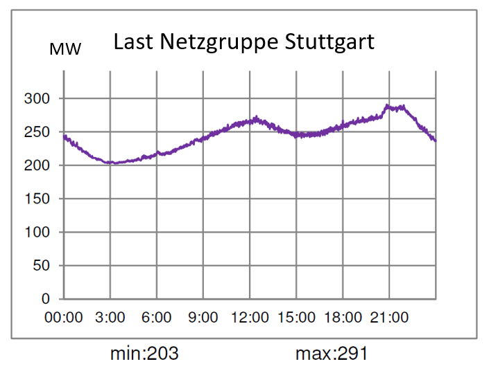 Allein in diesem Netzgebiet erzeugte das „PV-Flächenkraftwerk“ in der Spitze rund doppelt so viel Strom wie im gesamten Versorgungsgebiet der Netze BW. Und dies, obwohl die Spitzenlast kaum ein Drittel der maximalen Bezugslast des gesamten Netzgebiets ausmachte. An dem Hub von (grob) 1 GW Erzeugung zu 1 GW Last binnen rund sechs Stunden zeigt sich die starke Durchdringung von Photovoltaik-Erzeugung im ländlichen Raum, und man kann erahnen, welche Herausforderungen sich hier für den Netzbetreiber stellen – wohlgemerkt: hier, in Engstlatt. Ganz anders stellt sich nämlich die Situation in der Stadt dar, wie die folgende Abbildung der Lastkurve an eben diesem Ostersonntag für das Netzgebiet Stuttgart zeigt: