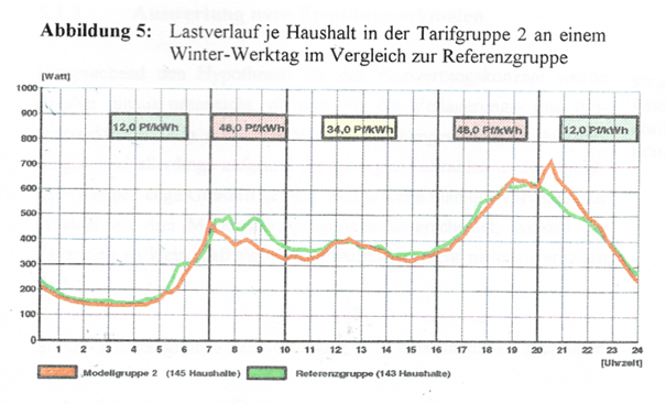 Der Hamburger Modellversuch zeigte aber auch, dass über die zeitvariablen Tarife neue Lastspitzen bzw. eine erhöhte Gleichzeitigkeit entsteht. Die Abbildung 5 aus dem Abschlussbericht, hier wiedergegeben, zeigt dies recht deutlich für die Tarifgruppe 2 (gleiches Bild für die Tarifgruppe 1).