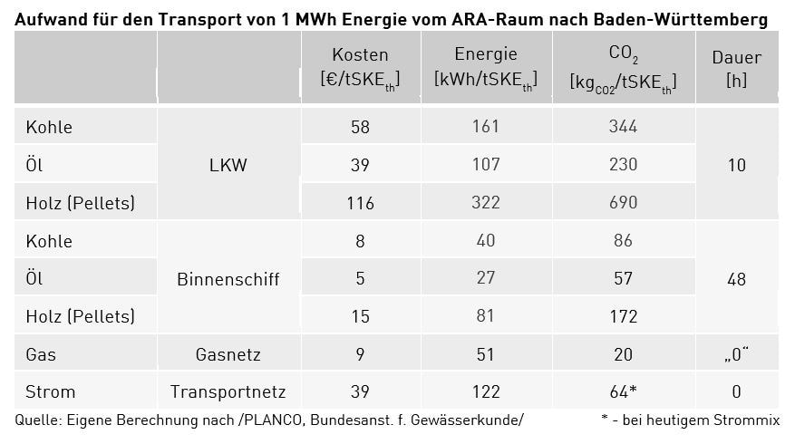 Aber was kostet eigentlich der Transport von Energie? Nehmen wir an, wir möchten Energie vom Großraum Amsterdam, Rotterdam, Antwerpen (kurz ARA) nach Baden-Württemberg bringen und uns ginge es wirklich nur um die Energie, d. h. wir wären indifferent, ob es sich um Strom, Kohle, Öl, Holzpellets oder Gas handelt. Was kostet das für die verschiedenen Typen? Und – da die Nachhaltigkeit unseres Handelns immer mehr in den Fokus rückt –: Wie viel Energie braucht der Transport von Energie, und welche CO2-Effekte ergeben sich? Schließlich: Wie lange dauert es, bis die Energie in Baden-Württemberg ist? Die folgende Tabelle versucht eine Abschätzung: