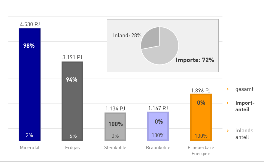 Die Situation beim Energieimport und ihre Wechselwirkung mit der Energiewende ist vergleichsweise binär. Allein die Braunkohle ist eine in Deutschland verfügbare größere konventionelle Primärenergiequelle, allerdings schon lange nicht mehr die wichtigste inländische Quelle – das sind die Erneuerbaren. In den großen Linien des Energiewendeprojekts haben wir das Thema Braunkohle aber mit dem Kohleausstieg bereits adressiert – der Braunkohleausstieg ist beschlossen und vorgezeichnet. Auf der Energiewende-To-do-Liste stehen also noch Mineralöl, Erdgas und Steinkohle, die allesamt (leicht abstrahierend) komplett importiert werden.