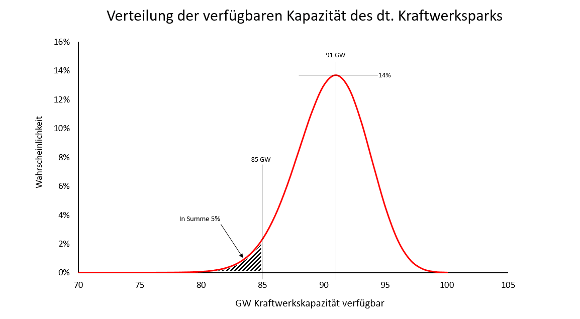 Bei einer Spitzenlast in Deutschland von ca. 83 GW sieht diese (sehr einfache) Leistungsbilanz komfortabel aus. Das Problem dämmert einem, wenn man sich vergegenwärtigt, was die Zahl 90,5 in der Tabelle wirklich ausdrückt. Fragt man sich, wie viel Kapazität der Kraftwerkspark zu einem Zeitpunkt in der Zukunft (zum Beispiel dem der Höchstlast) zur Verfügung stellt, dann ist „90,5 GW“ die Antwort mit der höchstenWahrscheinlichkeit. Es könnte auch sein, dass der Kraftwerkspark „wegen Pech“ nur 88 GW zur Verfügung hat oder – weil es gut läuft – 95 GW. Nur diese beiden Ereignisse haben geringere Wahrscheinlichkeiten als 90,5 GW. Leider hat dies aber auch eine einfache mathematische Konsequenz: Mit einer Wahrscheinlichkeit von annähernd 50 % liegt die verfügbare Kraftwerkskapazität unter 90,5 GW – es ist nicht klar, wie viel darunter, aber wenn es um die Sicherheit der Stromversorgung geht, ist 50 % eigentlich eine recht hohe und beunruhigende Wahrscheinlichkeit. Trotzdem beenden Leistungsbilanzvergleiche an dieser Stelle in der Regel die Analyse.