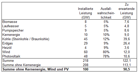 Wir haben uns angewöhnt, die Versorgungssicherheit der Stromversorgung (bezogen auf die Stromerzeugung) in Leistungsbilanzen zu betrachten. Wir vergleichen die Kapazität des Kraftwerkparks mit der Spitzennachfrage – ist die Kapazität des Parks (deutlich) größer, ist Versorgungssicherheit gegeben. Da Kraftwerke auch einmal ausfallen können, wird in so einer Betrachtung der einzelne Block nur korrigiert mit seiner Ausfallwahrscheinlichkeit einbezogen – ein typischer Kohlekraftwerksblock mit 600 MW und 10 % Ausfallwahrscheinlichkeit geht also nur mit 540 MW in die Summe ein. Erzeugung aus Wind und PV setzt man dabei gerne mit einer Leistung von Null an, da sie nicht sicher planbar zur Verfügung stehen. Der deutsche Kraftwerkspark hat damit (nach dem Kernenergieausstieg) eine Kapazität von ca. 90 GW, wie die nachfolgende Tabelle zeigt.