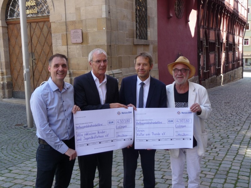 Letzte Woche haben wir in Esslingen zwei Spenden der Netze BW über jeweils 4.303,80 Euro übergeben – an die beiden Vereine Villa inklusives Kinder- und Jugendkulturhaus e.V. und Kultur am Rande e.V. Vielleicht wundert man sich über die krummen Beträge – dies liegt daran, dass an der Spende und insbesondere an der Höhe genaugenommen unsere Kunden schuld sind. Jeder Kunde meldet ja einmal im Jahr seinen Zählerwert des Stromverbrauchs an uns als Netzbetreiber. Er kann dies auf vielen verschiedenen Wegen tun. Wenn er aber einen digitalen Weg wählt, der uns das Porto der Rücksendepostkarte spart, dann spenden wir diese eingesparte Briefmarke an einen guten Zweck in seiner Gemeinde. In Esslingen haben dies im Jahr 2018 insgesamt 19.128 Kunden getan und damit für ebenso viele eingesparte 45 Cent-Briefmarken gesorgt, deren Geldwert jetzt zu gleichen Teilen an die beiden Organisationen gegangen ist.